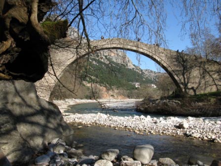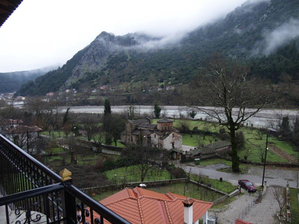 Ακριβώς δίπλα βρίσκεται ο μνημειακός βυζαντινός ναός της Πόρτα Παναγιάς κι ενα από τα μπαλκόνια βλέπει το μονότοξο πέτρινο γεφύρι.